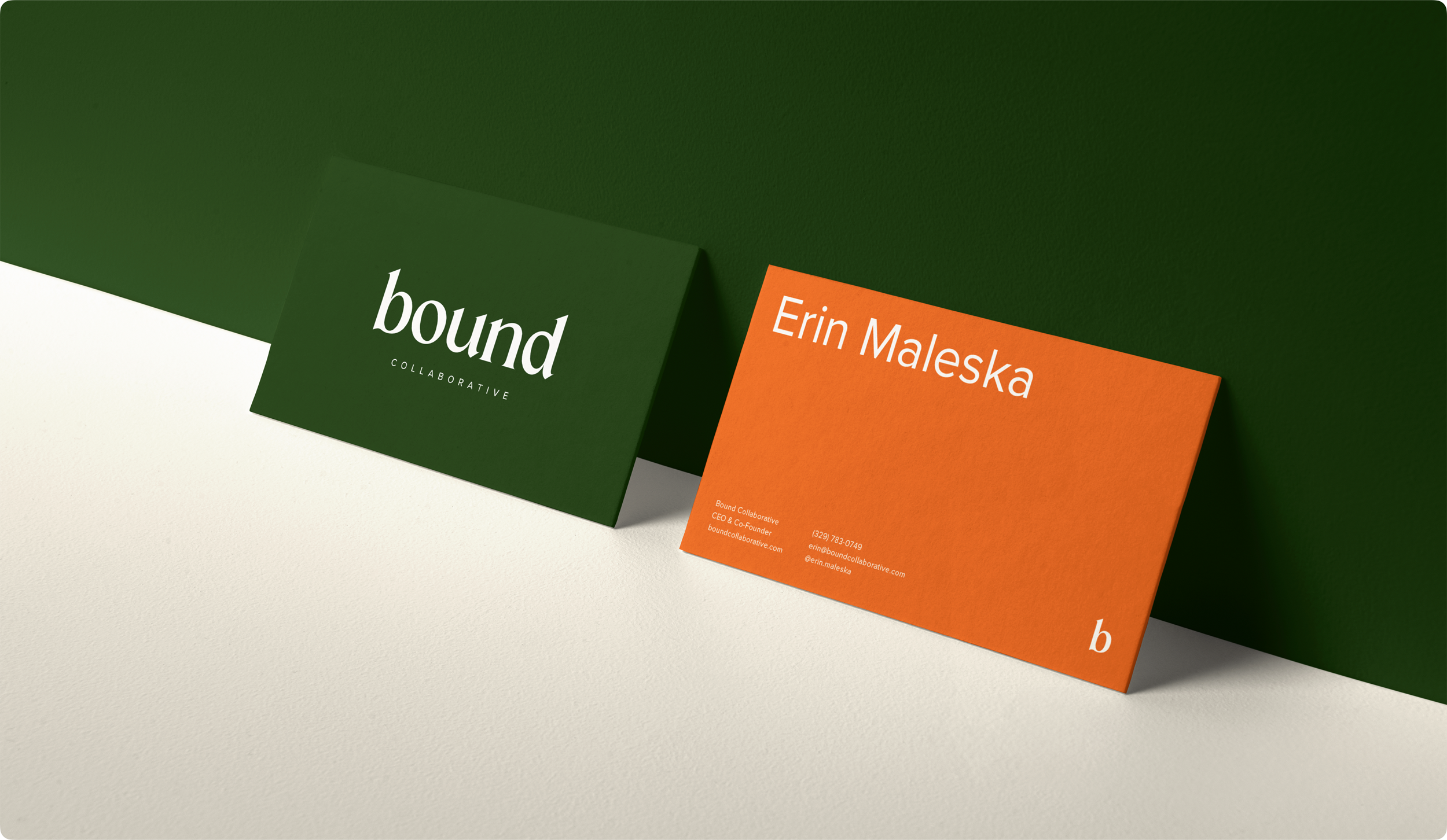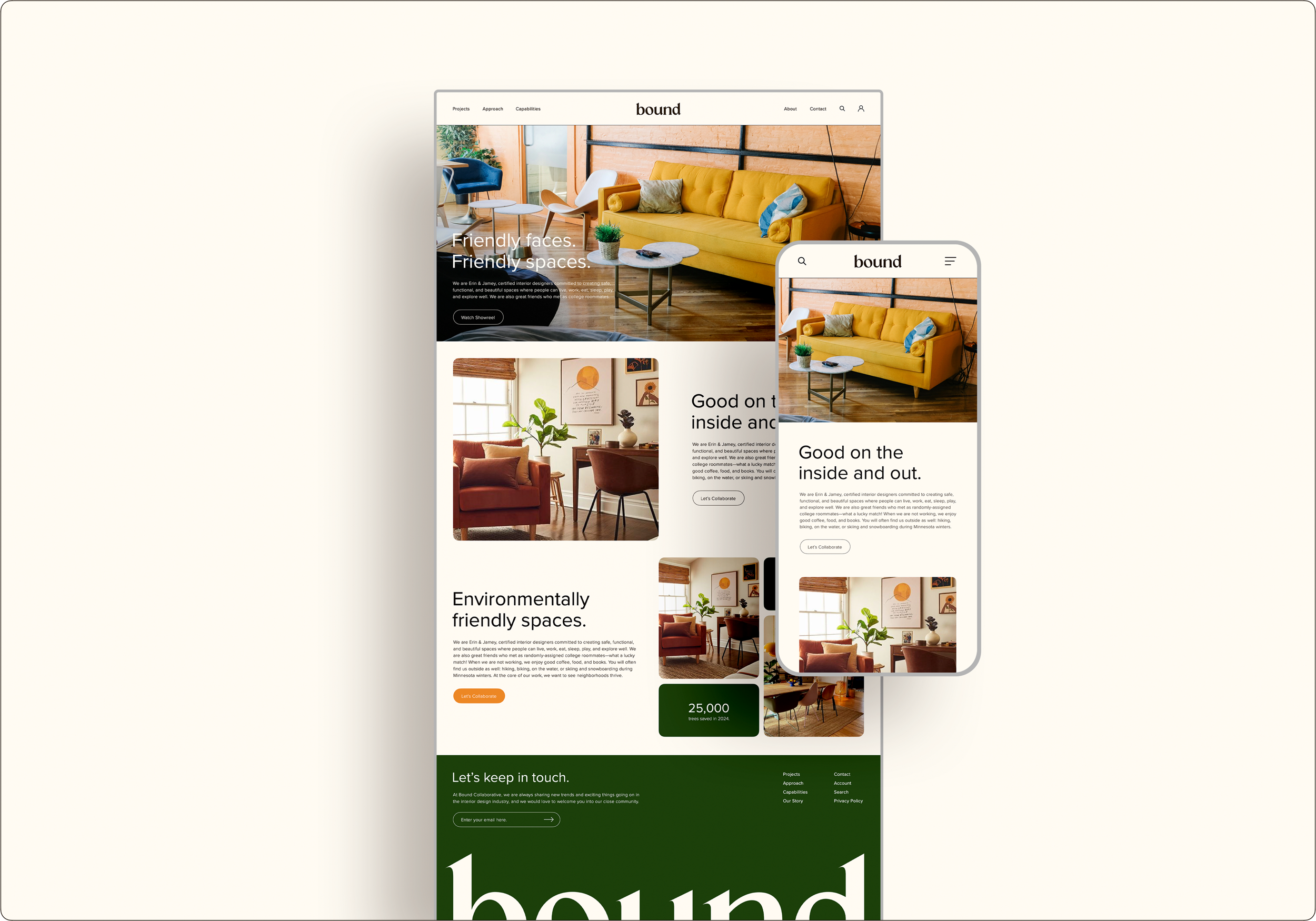 Bound Collaborative, a boutique interior design studio in Minneapolis, partnered with us to reimagine their brand identity. Led by Erin and Jamey, two college roommates turned creative collaborators, Bound is driven by a mission to design “beautiful, relaxed interiors that are good for those inside and out.” Their dedication to creating authentic, functional, and sustainable spaces while nurturing genuine relationships with clients inspired a refresh that captures their approachable, community-focused ethos.
